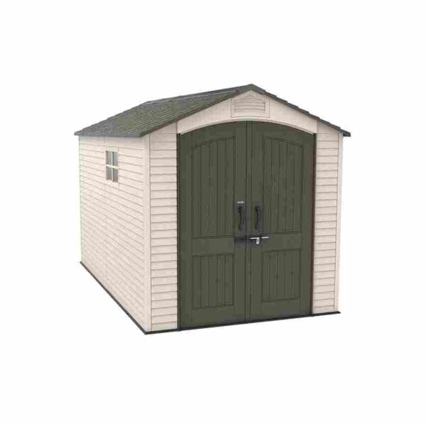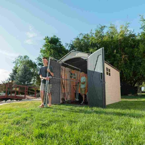 La cabane de jardin Lifetime #60282 est équipée de portes doubles renforcées en acier, dotées de verrous supérieurs et inférieurs pour une fermeture ultra sécurisée. Le loquet central permet d’ajouter un cadenas extérieur (non fourni), garantissant une protection supplémentaire contre les intrusions.