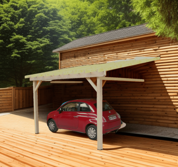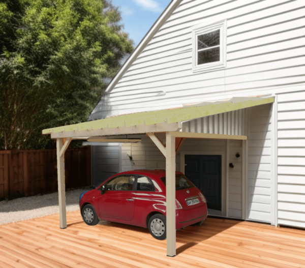 AM 3350 STL Carport bois adossé monopente mural sans couverture (pente 12°) avec préparation pour couverture légère (tôles ondulées, bac acier, Onduvilla, polycarbonate, volige + bardeau bitumé).