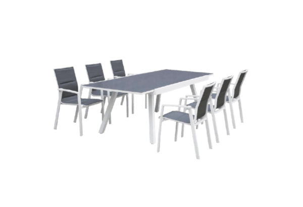 L’ensemble comprend six fauteuils ergonomiques conçus pour offrir un maximum de confort. Leur structure légère en aluminium revêtu d’une peinture époxy blanche assure solidité et résistance à la corrosion. L’assise et le dossier, réalisés en textilène rembourré gris foncé, intègrent une mousse à séchage rapide, idéale pour une utilisation extérieure.