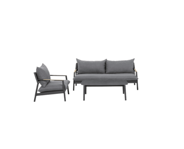 Le salon de jardin 3 places se compose d’un canapé spacieux deux places (181 x 84 x 67 cm), d’un fauteuil ergonomique (78 x 84 x 67 cm), et d’une table basse assortie (120 x 65 x 38 cm). Chaque pièce est fabriquée à partir d’une structure en aluminium recouverte d’une peinture époxy anthracite, assurant une excellente résistance aux intempéries et à la corrosion. Ce choix de matériau léger et robuste garantit une longévité exceptionnelle, même en cas d’exposition prolongée aux éléments.