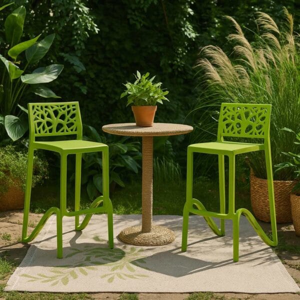 Un tabouret haut vert permet ainsi d’introduire un accent coloré sans compromettre l’équilibre visuel d’une pièce ou d’un jardin.