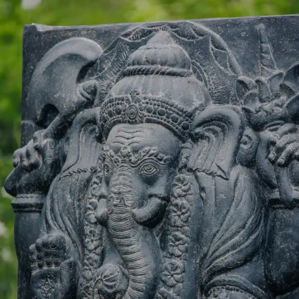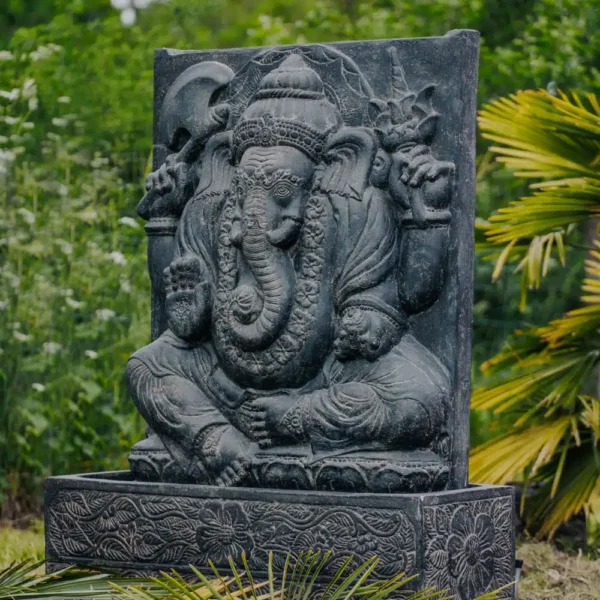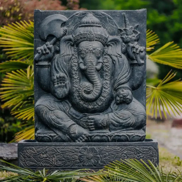 Cette magnifique fontaine de Ganesh est composée de 2 pièces, la statue/fontaine principale de Ganesh et le bassin qui recueille l’eau qui s’écoule, décoré d’une fleur de lotus au centre et de vrilles tourbillonnantes sur les 3 côtés du bassin.