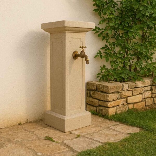 La colonne creuse de cette fontaine en pierre a été pensée pour faciliter le raccordement à votre réseau d’eau existant. Elle permet de faire passer un tuyau d’alimentation depuis le sol sans besoin de travaux complexes. Un kit robinet simple est fourni avec la fontaine, pour une installation rapide et pratique.