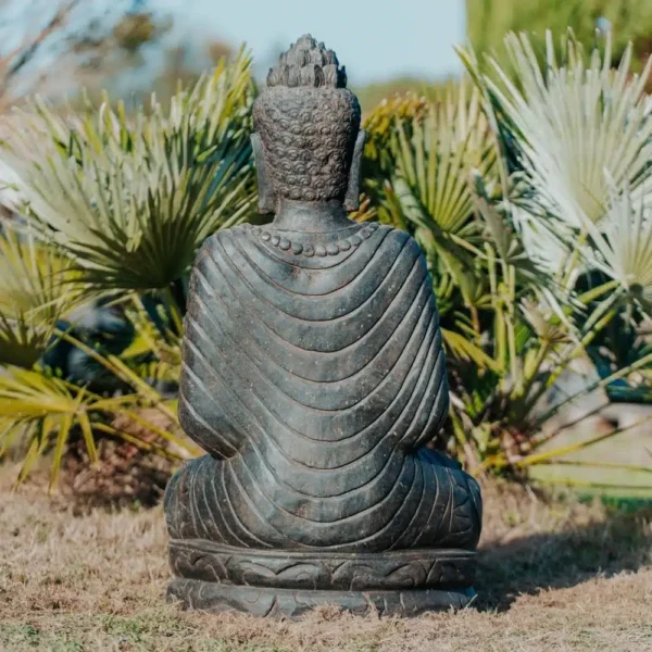 Réalisée en pierre naturelle, cette statue est résistante et s’intégrera parfaitement à tout type d’environnement, du plus moderne au plus traditionnel. Que vous soyez un fervent bouddhiste ou simplement à la recherche d’une décoration zen, cette statue saura vous séduire par son authenticité et son élégance. Le Bouddha est assis en tailleur dans la position padmasana ou position assise du “Lotus complet”. Il a un léger sourire sur les lèvres et un beau visage encadré par de longs lobes d’oreilles.