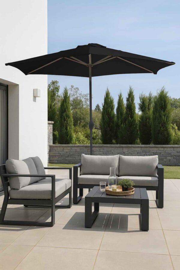 Avec sa teinte noire intemporelle, le parasol droit Séville s’intègre facilement à tout type d’aménagement extérieur. Que vous possédiez un salon de jardin contemporain, un mobilier en bois exotique ou une terrasse minérale, ce parasol design ajoute une touche de raffinement contemporaine et discrète à l’ensemble.