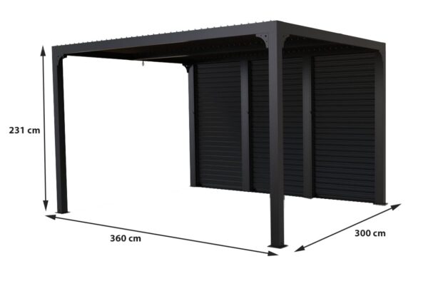 PER 36V30 BI Pergola aluminium bioclimatique protégée par un revêtement époxy, toit avec 78 lames à ouverture avec une manivelle et avec ventelles latérales pour côté 3,60 m