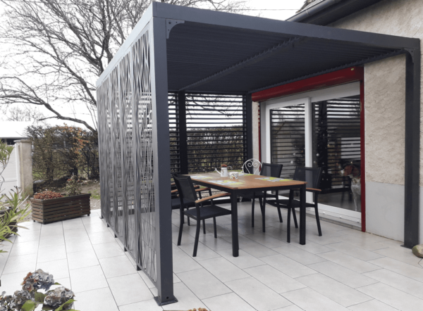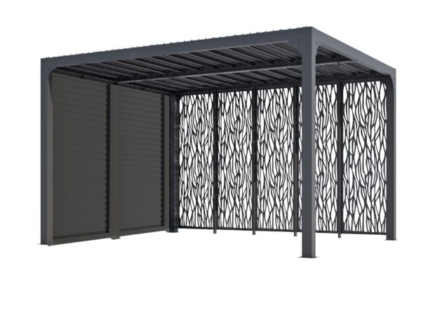 PER 36M30V BI Pergola aluminium bioclimatique protégée par un revêtement époxy, avec 78 lames à ouverture avec une manivelle avec 5 panneaux moucharabieh pour côté 3,60 m et ventelles latérales aluminium mobiles pour côté 3 m