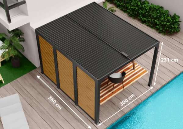 PER 36VB30 BI Pergola aluminium bioclimatique protégée par un revêtement époxy, toit avec 78 lames à ouverture avec une manivelle et avec ventelles latérales pour côté 3,60 m