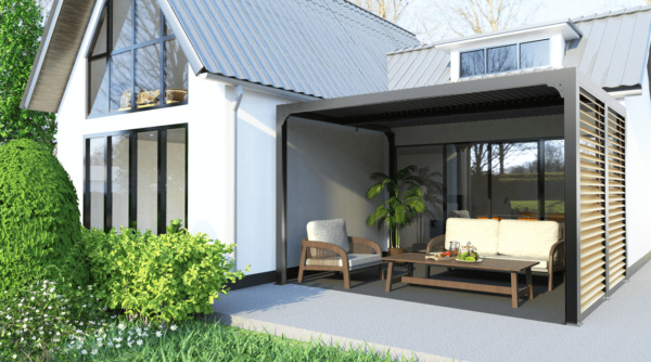 PER 3630VB BI Pergola aluminium bioclimatique protégée par un revêtement époxy, toit avec 78 lames à ouverture avec une manivelle et avec ventelles latérales pour côté 3 m